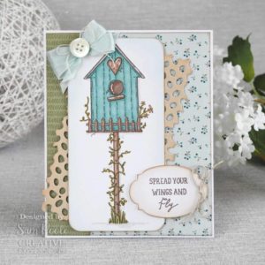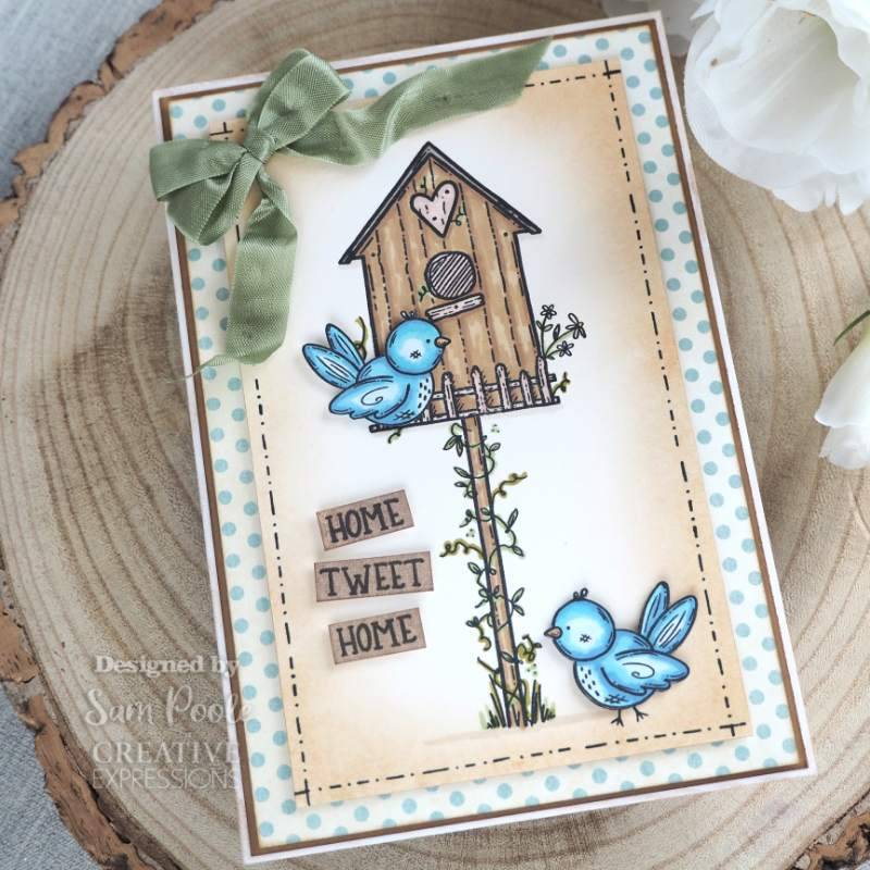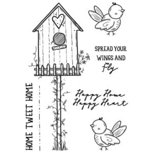 Happy Home Stamp Set. This set of beautifully hand drawn clear stamps depict a pretty birdhouse with bird and sentiments. This clear stamp set is ready for you to colour. Designed by Sam Poole for Creative Expressions. This set can be used for all your crafting projects. Â Ready to colour using paints, distress inks, pixie powders and more! These clear stamps are ready to mount onto an acrylic block or for use in a stamping platform for crisp images. Designed and made in the UK. A6 size seven stamp clear polymer set.