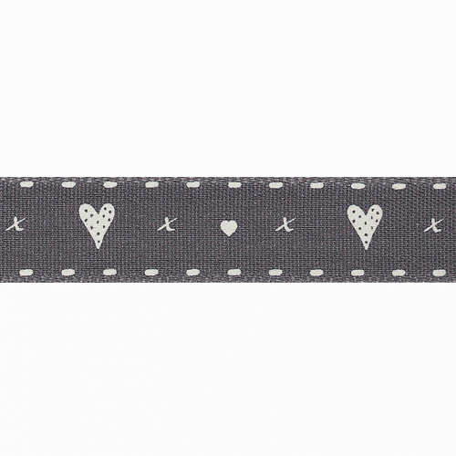 Charming heart design in grey with stitching detail and mini dots. 15mm. Dry clean or wash at 50 degrees. Tumble dry. Cool iron.